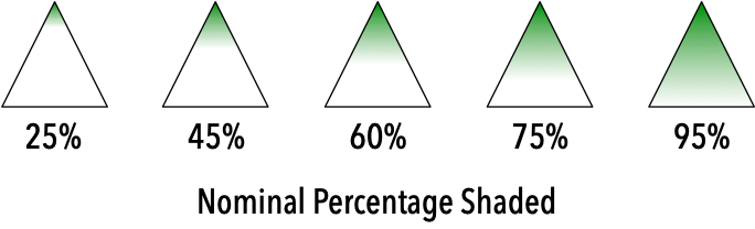 In my pilot study, the stimuli were white triangles in which a percentage of the area was shaded green (examples below). Note that this was nominal percentage as determined by a graphics program; I’m not sure the percentages pass the eyeball test for accuracy, but they do represent a clear ordinal gradation).