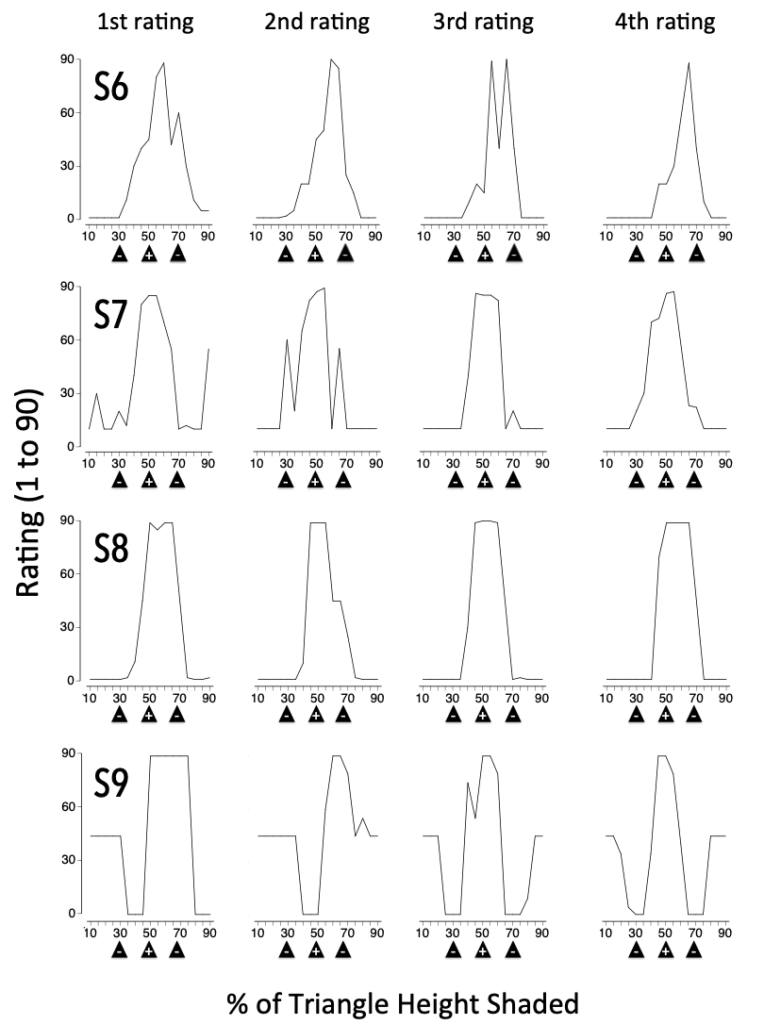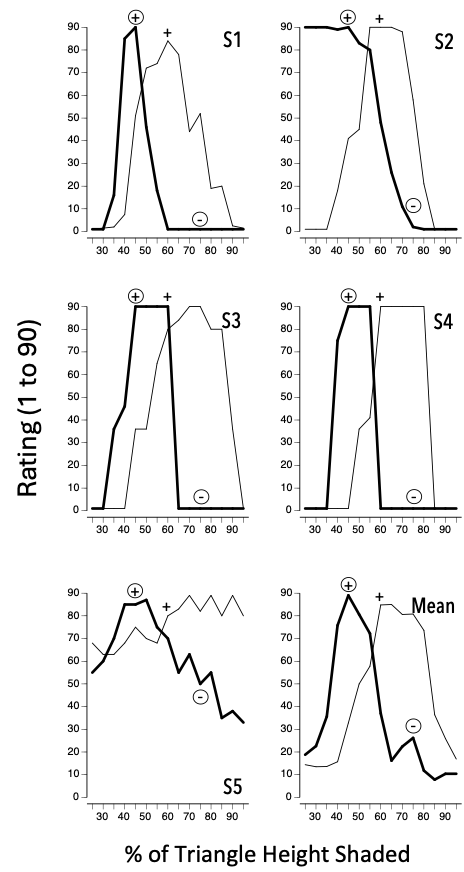Again, there’s one clunker participant (S5), who showed no obvious stimulus control after differential training (note, however, that weak control following nondifferential training isn’t rare in the literature). Otherwise, the gradients obtained after nondifferential training were fairly symmetrical, as shown in the published literature. All participants showed a classic peak shift, in this case indicating that a stimulus to the left of the actual S+ (less green shading) was the one rated as “most like S+.”