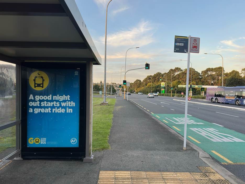 Figure 1. Bus shelter advertisement from the public transport campaign emphasising safety benefits for nighttime travel.